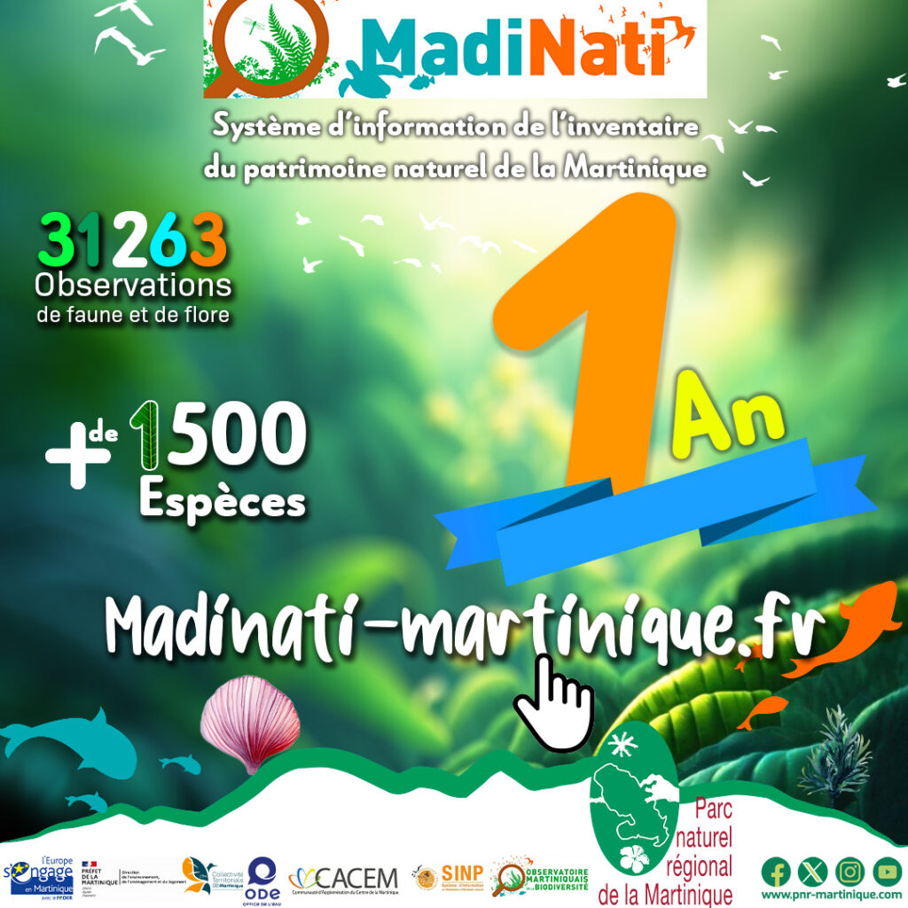 Lancé en novembre 2022, son but est de faciliter l’accès aux données concernant la répartition de la biodiversité dans les milieux terrestres, aquatiques et marins. MadiNati a pour objectif de compiler les données de personnes-ressources ainsi que de structures permettant d’établir des données d’observation de la biodiversité. MadiNati constitue le “SNIP” de Martinique, signifiant Système d’Information de l’Inventaire du Patrimoine naturel. Sur la plateforme, on retrouve les fiches descriptives de toutes les espèces présentes en Martinique, ainsi que les observations de faune et de flore saisies. Vous pouvez tout savoir sur le patrimoine naturel qui vous entoure.