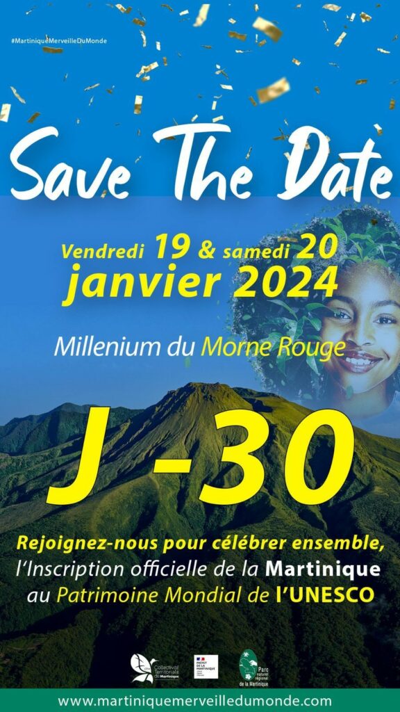 Vendredi 19 et samedi 20 janvier 2024… notez dejà les dates auxquelles vous allez nous rejoindre pour célébrer ensemble l’inscription officielle de #MartiniqueMerveilleduMonde au Patrimoine Mondial